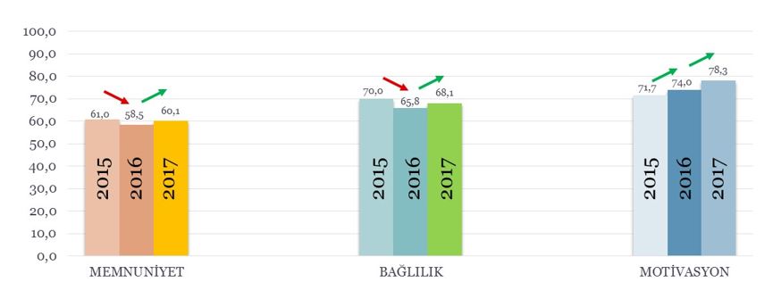 Beyaz yakalı çalışanların son üç yıldaki memnuniyet, bağlılık ve motivasyon skorlarına bakarsak; 2016 yılında ülkemizin içinde bulunduğu olumsuz durumlar nedeni ile çalışanların da memnuniyet ve bağlılık değerlendirmelerinin olumsuz yönde etkilendiğini görüyoruz. 2017 yılında ise tekrardan 2015 seviyelerine gelmiş bulunmaktayız. Yalnız dikkat çeken bir durum motivasyon skorları: Ne olursa olsun çalışanlar motivasyonlarından bir şey kaybetmediğini beyan etmiş.